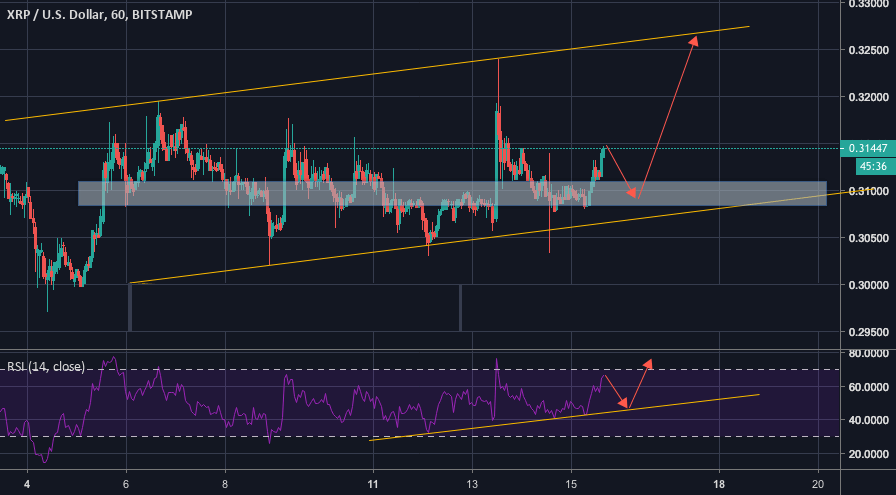 Криптовалюта Ripple XRP/USD продолжает движение в рамках восходящего канала. В момент публикации прогноза стоимость Ripple к Доллару США составляет 0.3144. На данный момент стоит ожидать попытку падения и тест уровня поддержки вблизи области 0.3105. Затем отскок и продолжение роста криптовалюты в область выше уровня 0.3260.