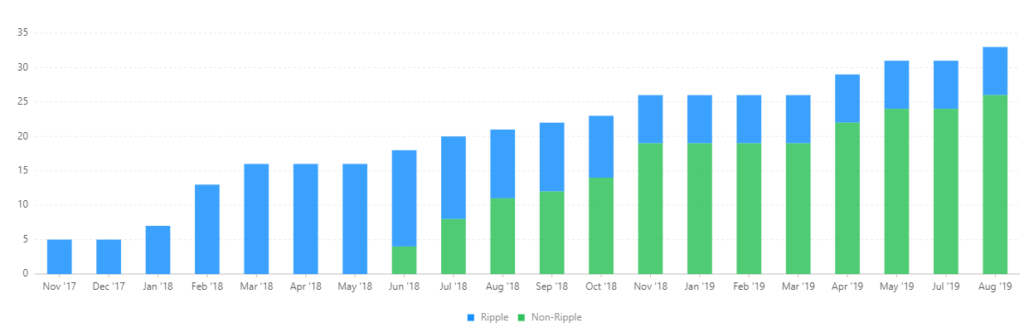 Ripple сократила количество валидаторов в dUNL, до 21,2%, что стало решением некоего спора. На данный момент в dUNL есть 33 валидатора, из которых 7 относятся к Ripple, 25 – независимые и 1 – неизвестный. График показывает, что количество уникальных узлов, не относящихся к Ripple, увеличивается с июня 2018 года.