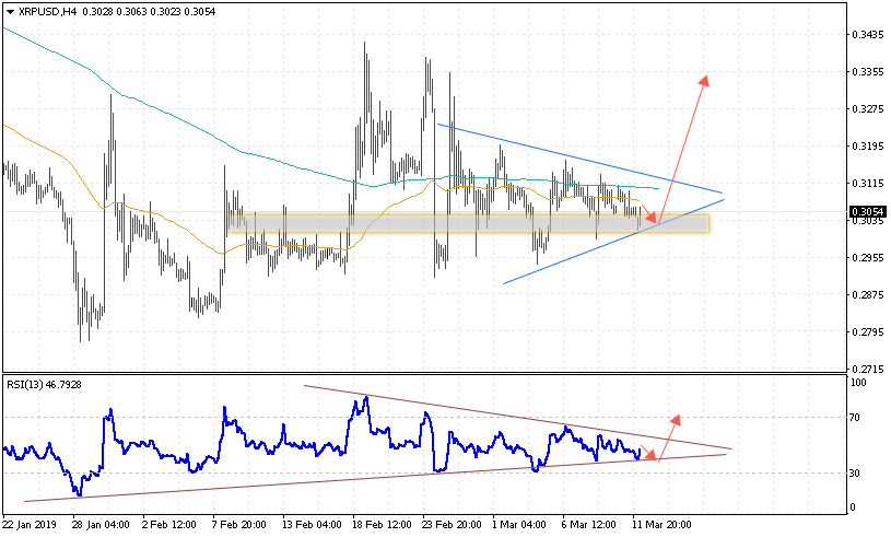 В пользу роста котировок XRP/USD выступит тест нисходящей линии тренда на индикаторе относительной силы. Вторым сигналом выступит отскок от нижней границы модели «Треугольник». Отменой варианта роста криптовалюты станет падение и закрытие котировок ниже уровня 0.2925. Это укажет на пробой области поддержки и продолжение падения XRP/USD в область ниже уровня 0.2725. С пробоем верхней границы модели «Треугольник» и закрытием выше уровня 0.3185 стоит ожидать подтверждения развития роста по Ripple.
