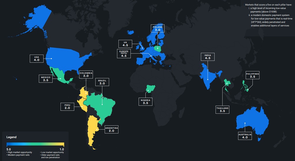 Ripple определила 14 ключевых регионов – Аргентину, Австралию, Бразилию, Колумбию, Европу, Польшу, Индию, Мексику, Нигерию, Перу, Филиппины, Таиланд, Великобританию и США – которые обладают «высоким потенциалом». По шкале от 1 до 5 (от желтого к синему) «синие страны» на карте являются наиболее привлекательными, поскольку у них «I.) высокий уровень входящих небольших платежей (более 100 миллиардов долларов)» и «II.) современная отечественная система мелких платежей».