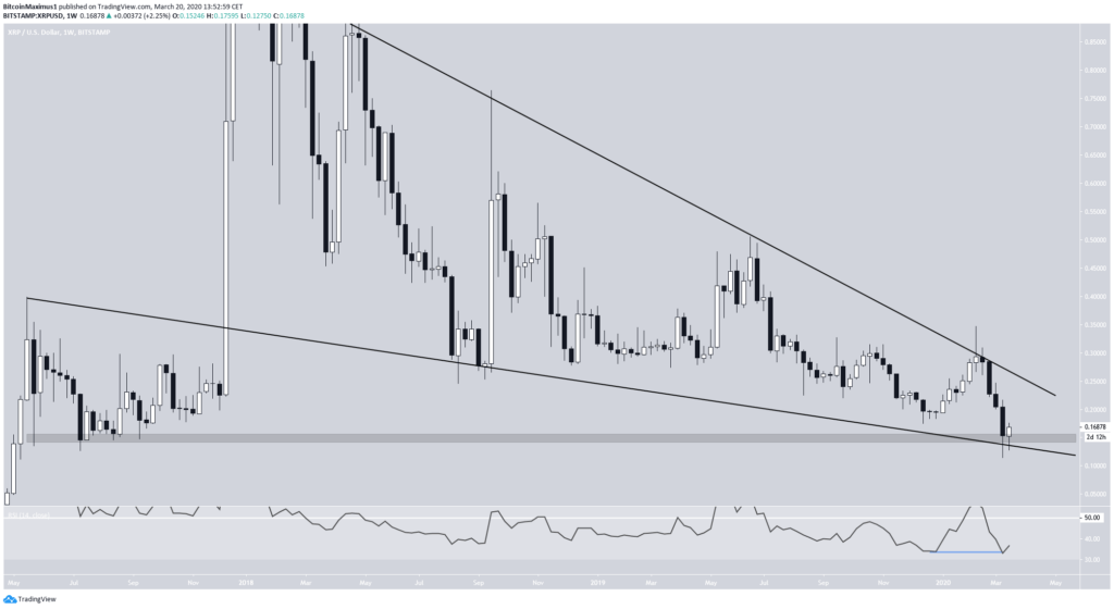 12 марта курс XRP нырнул под важную область поддержки $0.15. Таким образом, неделю цена консолидировалась под этой поддержкой. 19 марта цена смогла восстановиться и удержаться