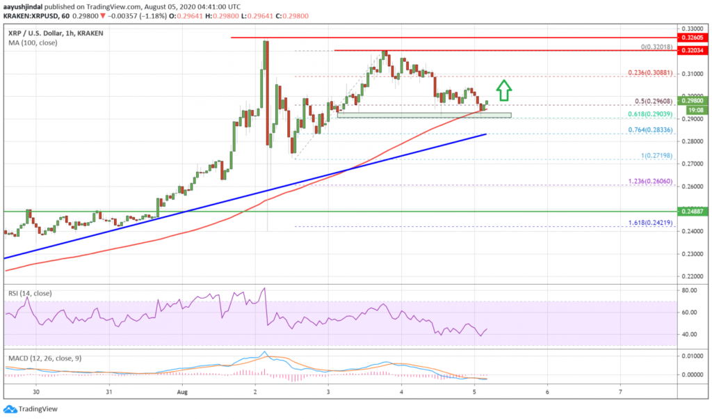 Недавно Ripple XRP торговался ниже $0,3020 по отношению к доллару США. После этого Ripple XRP все же удалось частично подняться, однако цифровой актив снова в зоне понижения. Тем не менее, на часовом графике пары XRP / USD формируется основная линия тренда повышения с поддержкой около $0,2840.