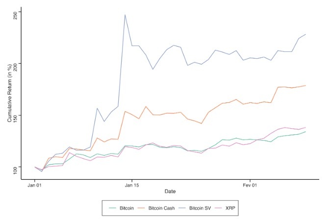 Наибольшую положительную динамику наблюдали Bitcoin SV и Bitcoin Cash с совокупной доходностью 228% и 179% соответственно. Другие основные монеты, такие как Binance (BNB), EOS , Ether, Litecoin, Tezos (XTZ)  и XRP предложили инвесторам совокупный возврат между 138% и 167%. Между тем, цена на золото в январе выросла чуть выше на 4%.