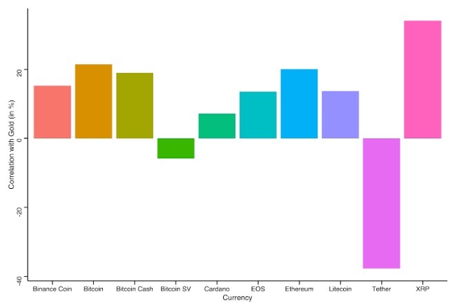 Анализируя корреляции между топ-10 криптовалют на рынке и доходностью золота в январе 2020 года, мы неожиданно обнаружили, что XRP, а не Биткойн, имеет самую сильную корреляцию с золотом. XRP коррелирует на уровне 34,1%, а Биткойн (BTC) – на 21,5%. Более того, как Ether (ETH), так и Bitcoin Cash (BCH) имеют очень похожую корреляцию с золотом, как Bitcoin с 20,1% и 19% соответственно.