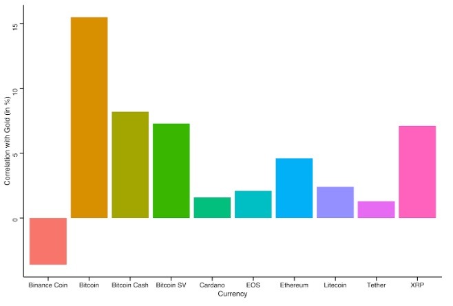 Если посмотреть на более широкие временные рамки, такие как 2019 год, то предположение о том, что Биткойн больше связан с золотом, подтверждается. Биткойн коррелируется на уровне 15,5% с золотом за весь 2019 год, будучи самой коррелированной валютой с золотом из топ 10.