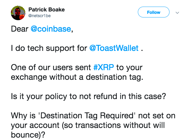 Coinbase Pro достаточно четко объявила о необходимости прописывать тег назначения во время объявления о добавлении XRP в свой листинг. Была даже создана отдельная страница с описанием тега назначения. Стоит отметить, что токены даже в случае ошибки совсем утерянными не будут. Биржа обязана проверять все транзакции, а потом отправить пользователю обратно криптовалюту. Coinbase Pro сначала отказывалась это делать, за что ее и критиковали.